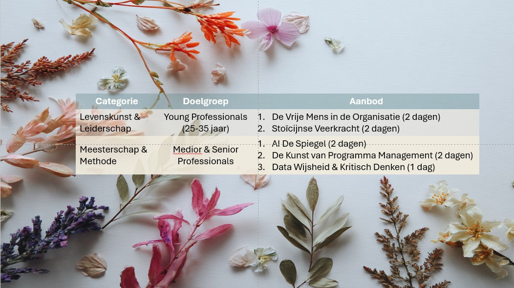 Gericht op medior en senior professionals voor het verder ontwikkelen van concrete vaardigheden zoals strategisch en conceptueel denken, besluitvorming onder complexiteit, moreel oordeelsvermogen, analytisch inzicht, het interpreteren van data in context en het verbinden van lange termijnvisie aan dagelijkse keuzes. Deze cursussen putten uit de domeinen van programmamanagement, data literacy, AI en ethiek — en benaderen die vanuit de diepere vraag: wat is goed handelen in een complexe wereld? Je leert niet alleen de tools, maar ook het denkraam dat nodig is om koers te houden als mens én als professional.